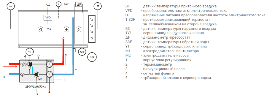Такими внешними устройствами, важными для работы вентиляционного агрегата, являются устройства, которые обеспечивают поступление воды с требуемой температурой в водяной нагреватель. Например узел регулирования тепловой мощности нагревателя.