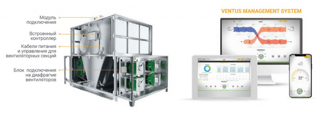 Несмотря на такие небольшие размеры, компактный агрегат с модулем HEX может использоватьсяв объектах с различными функциональными требованиями. Функциональное разнообразие достигается за счет применения функциональных модулей (например, нагревателя, охладителя или дополнительных воздушных фильтров), содержащихся в отдельных корпусах. Общая, интегрированная с агрегатом, установленная на заводе система регулирования и управления гарантирует полную реализацию необходимых функций.