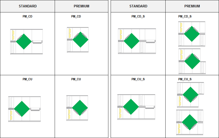 Перенесение камеры смешивания в пространство байпаса приводит к тому, что агрегаты в перекрестноточным рекуператором с камерой смешивания с опцией PREMIUM в большинстве своём короче агрегатов с опцией STANDARD. Различие составляет от 366 до 730 мм в зависимости от модели.