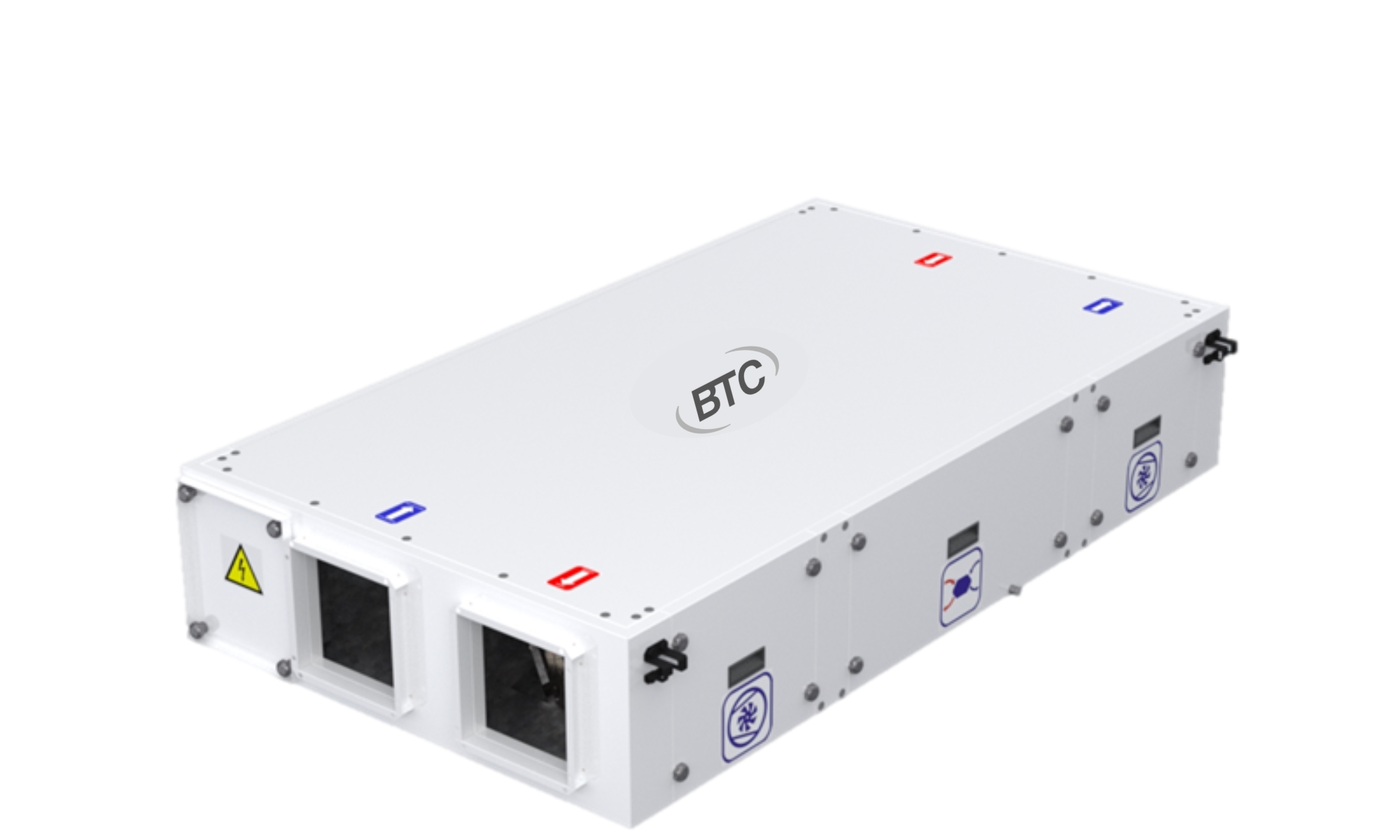 Компактные подвесные агрегаты для вентиляции и кондиционирования воздуха BTC Compact S имеют высокоэффективные перекрестноточные гексагональные рекуператоры с КПД до 90%.