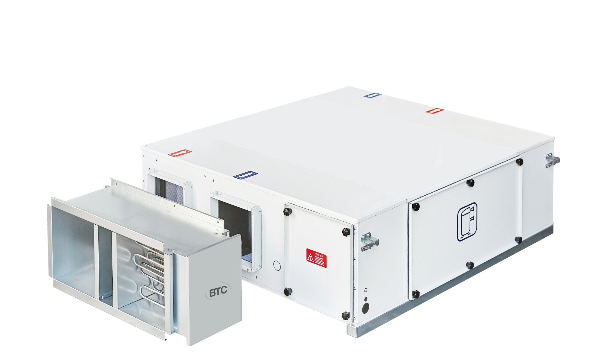 Подвесные агрегаты BTC S — это энергосберегающие компактные устройства, которые используются для вентиляции и кондиционирования воздуха, размещаются под потолком для экономии пространства. Наружный воздух проходит через рекуператор и нагревается удаляемым воздухом из вентилируемых помещений, проходящим через тот же теплообменник, два воздушных потока не смешиваются друг с другом. Компактные подвесные агрегаты не требуют большого технического пространства для монтажа и используются на таких объектах, как торговые центры и офисные здания.