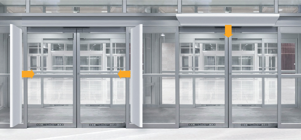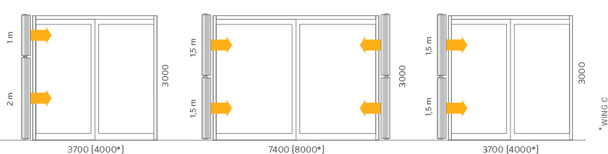 Воздушная завеса ВИНГ доступна в трех типоразмерах — 1 м, 1,5 м, 2 м. Завесы можно группировать друг с другом в различных вариантах, что позволяет надежно защитить любые входы здания.