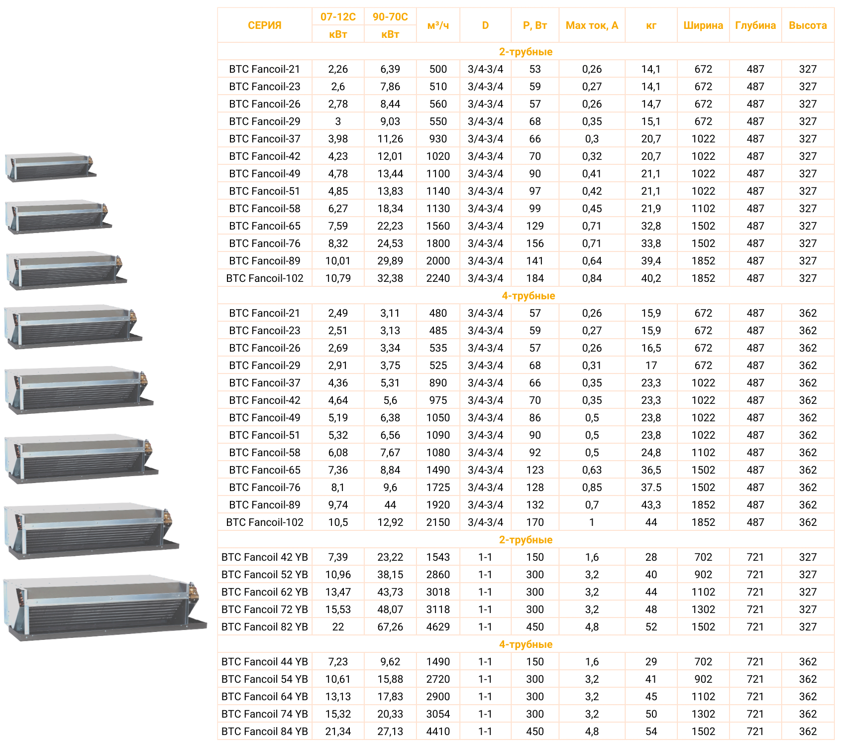 - Холодопроизводительность при 7 – 12°С: от 2,26 кВт до 21,34 кВт