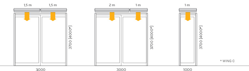 Воздушная завеса ВИНГ доступна в трех типоразмерах — 1 м, 1,5 м, 2 м. Завесы можно группировать друг с другом в различных вариантах, что позволяет надежно защитить любые входы здания.
